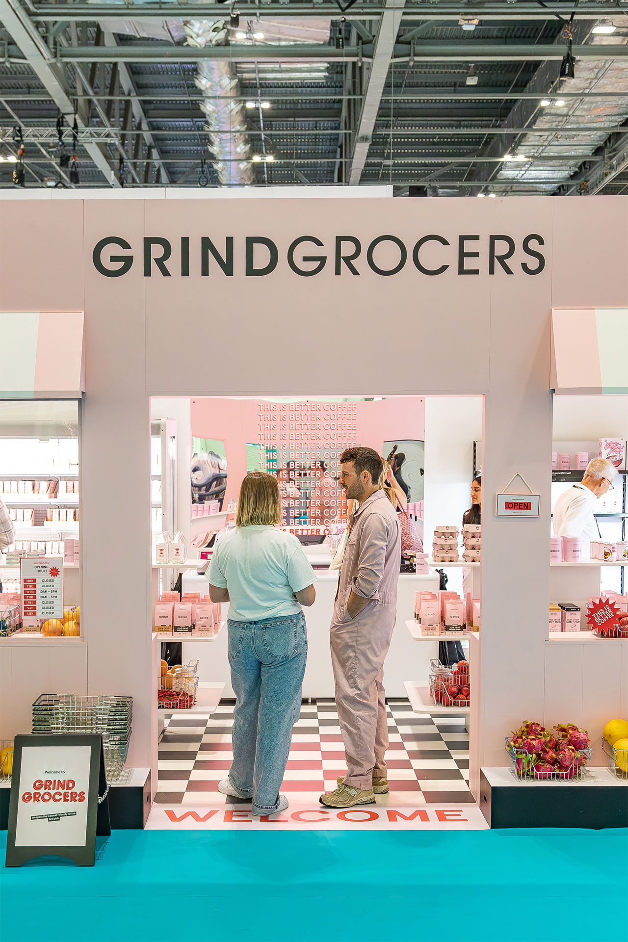 Grind needed to shift perception—from being seen primarily as a café brand to a serious contender in the retail coffee space. Their activation at LUNCH! had to cut through the noise, showcase their products in an engaging way, and make a lasting impression on retailers. At this year’s LUNCH! event, we turned heads with Grindgrocers—a playful, pink-tinted supermarket-style activation designed to showcase Grind as a coffee company, not just a café.