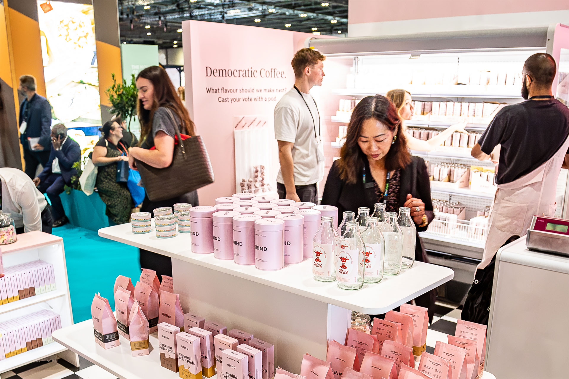 We built Grindgrocers, a witty, retro-futurist grocery store bursting with pink. Shelves were stacked with Grind products and cheeky ‘grocer-style’ props. A sampling bike kept the coffee flowing, while playful touchpoints—like a Waitrose-style voting booth for the next product launch—kept visitors engaged.